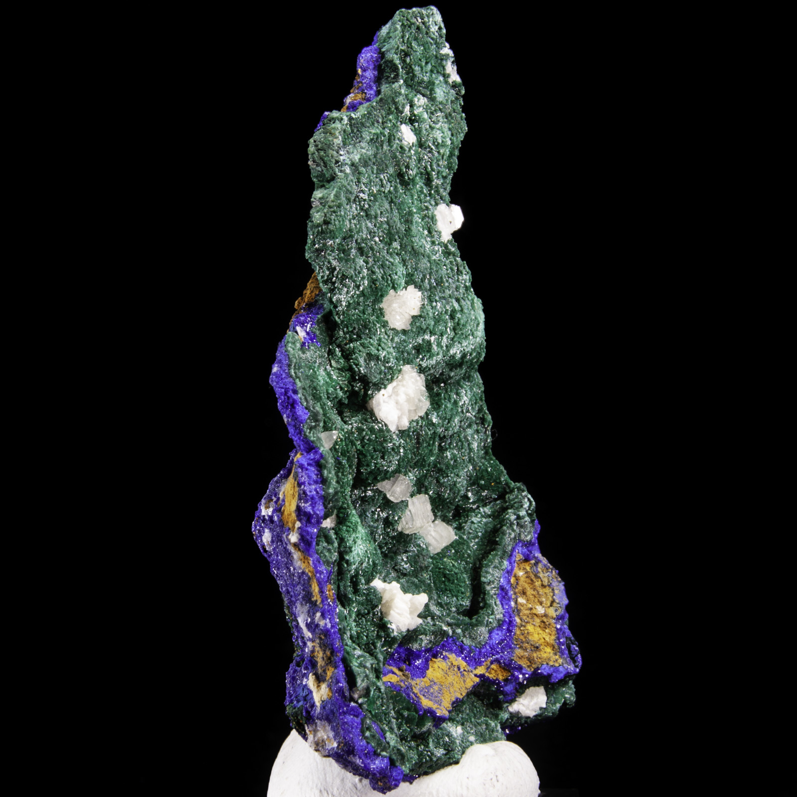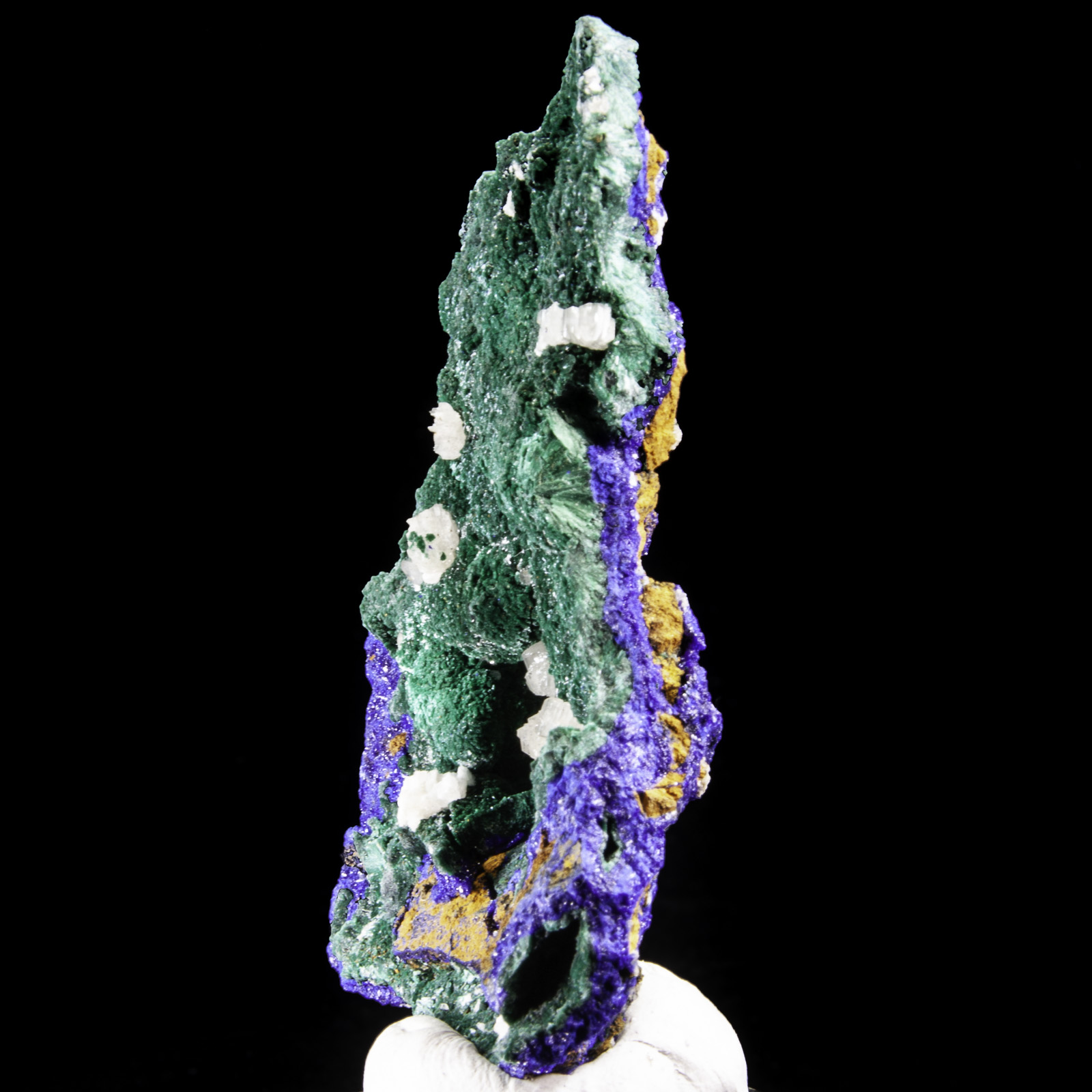 Mineral Description: A matrix of deep blue azurite and deep green malachite crystals hosts several off-white cerussite crystals. Height: 7.2 Width: 5 Depth: 1 cm