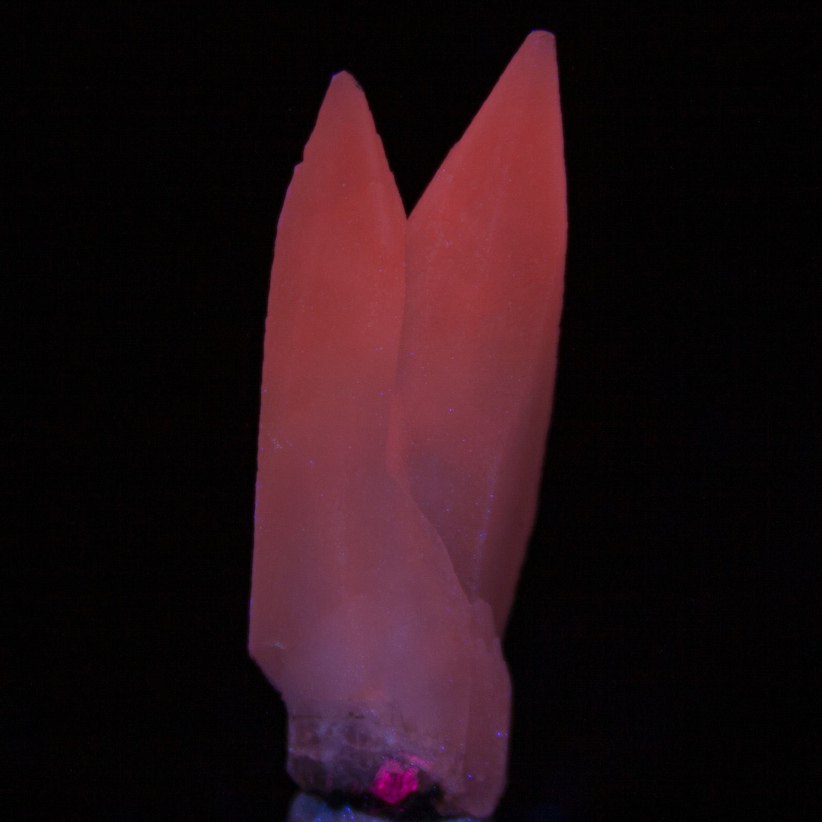 Mineral Description: A pair of intergrown calcite scalenohedrons. Great fluorescence and no damage. Height: 5.5 Width: 2 Depth: 1.5 cm