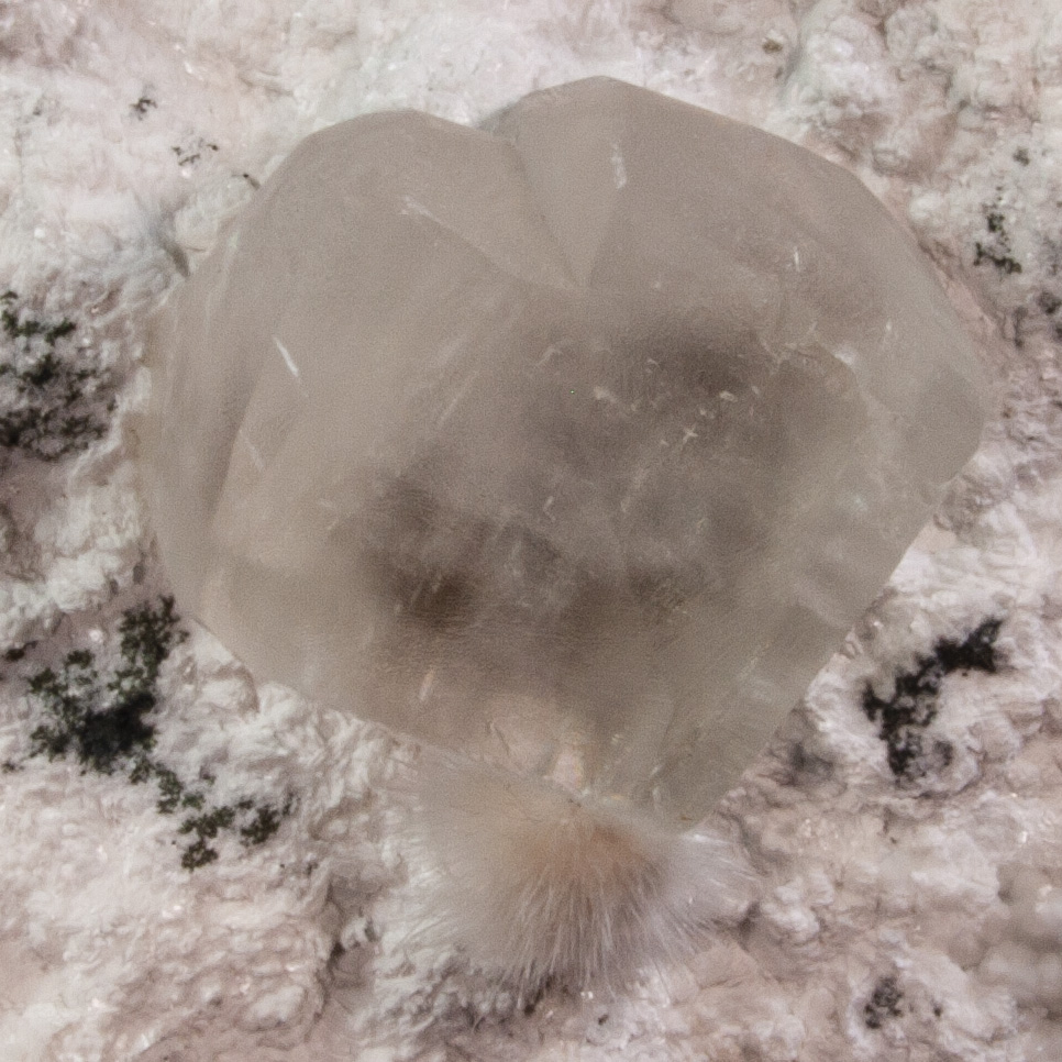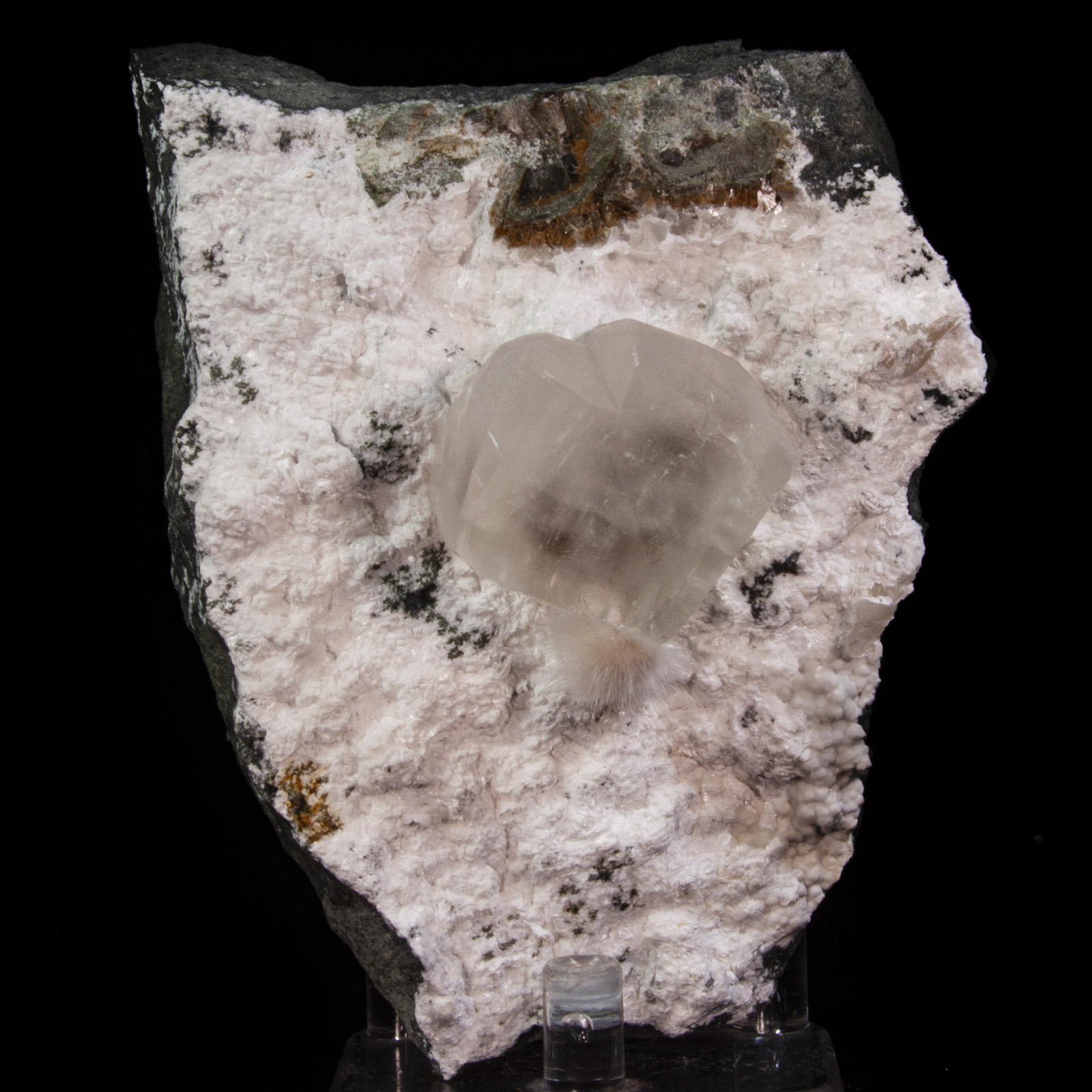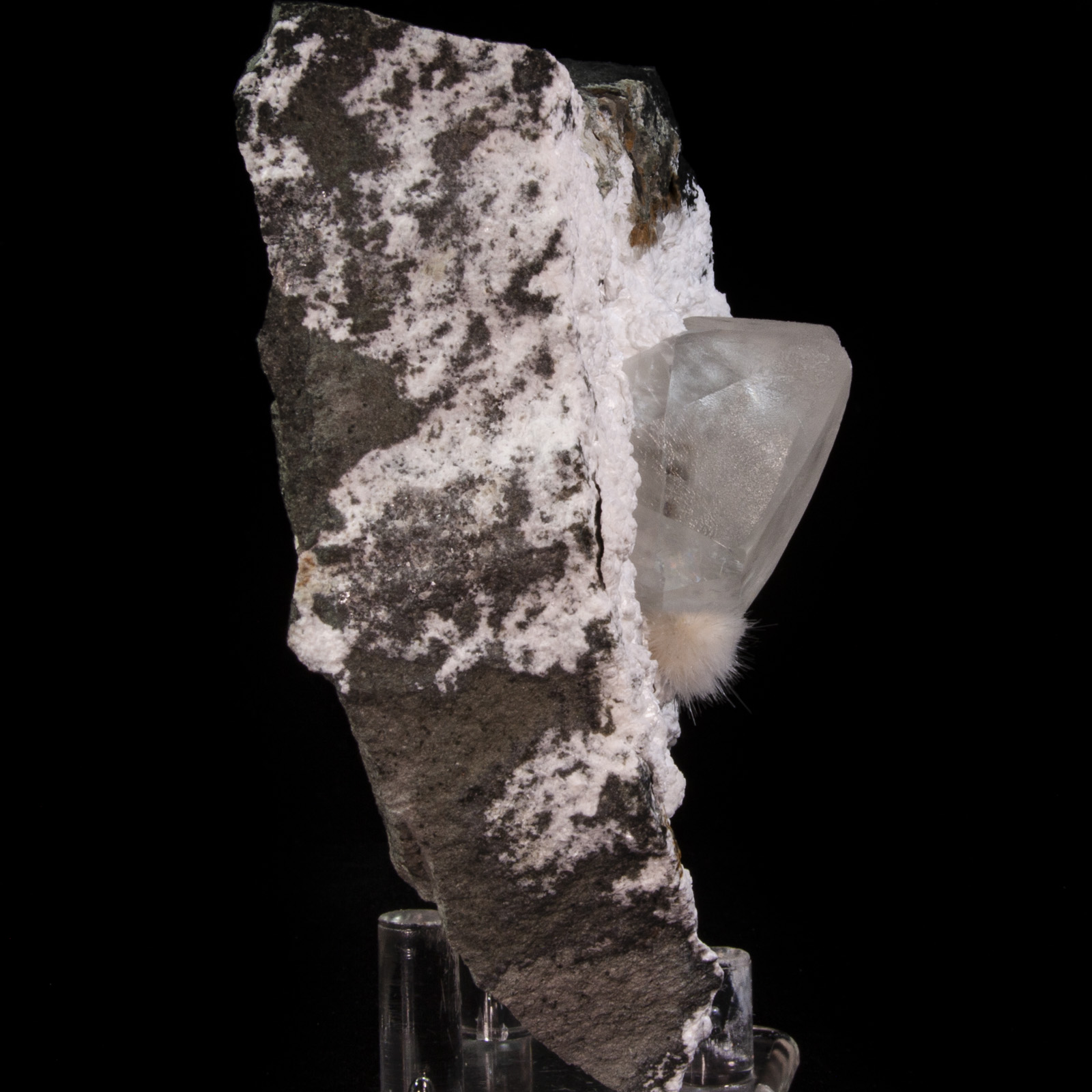 Mineral Description: A basalt matrix coated with a white zeolite layer (laumontite?) that has a single twinned calcite crystal and a small spray of okenite in the center. The calcite is 3.5 cm tall. Excellent condition. Height: 10.5 Width: 7.5 Depth: 5 cm