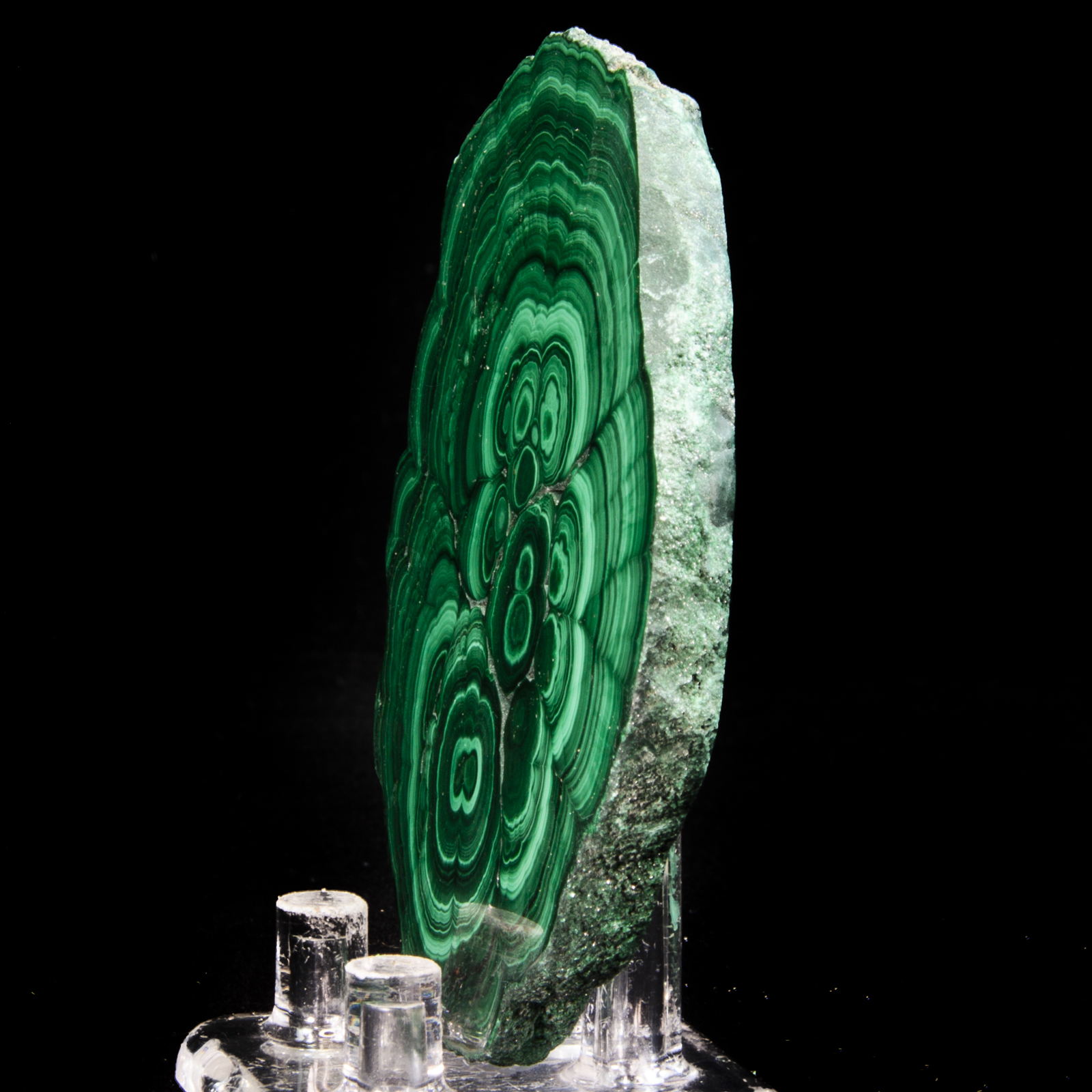 Mineral Description: A slice through a complex malachite stalactite. The specimen is polished on both sides and exhibits beautiful banding patterns. Height: 7.5 Width: 6.8 Depth: 0.5 cm