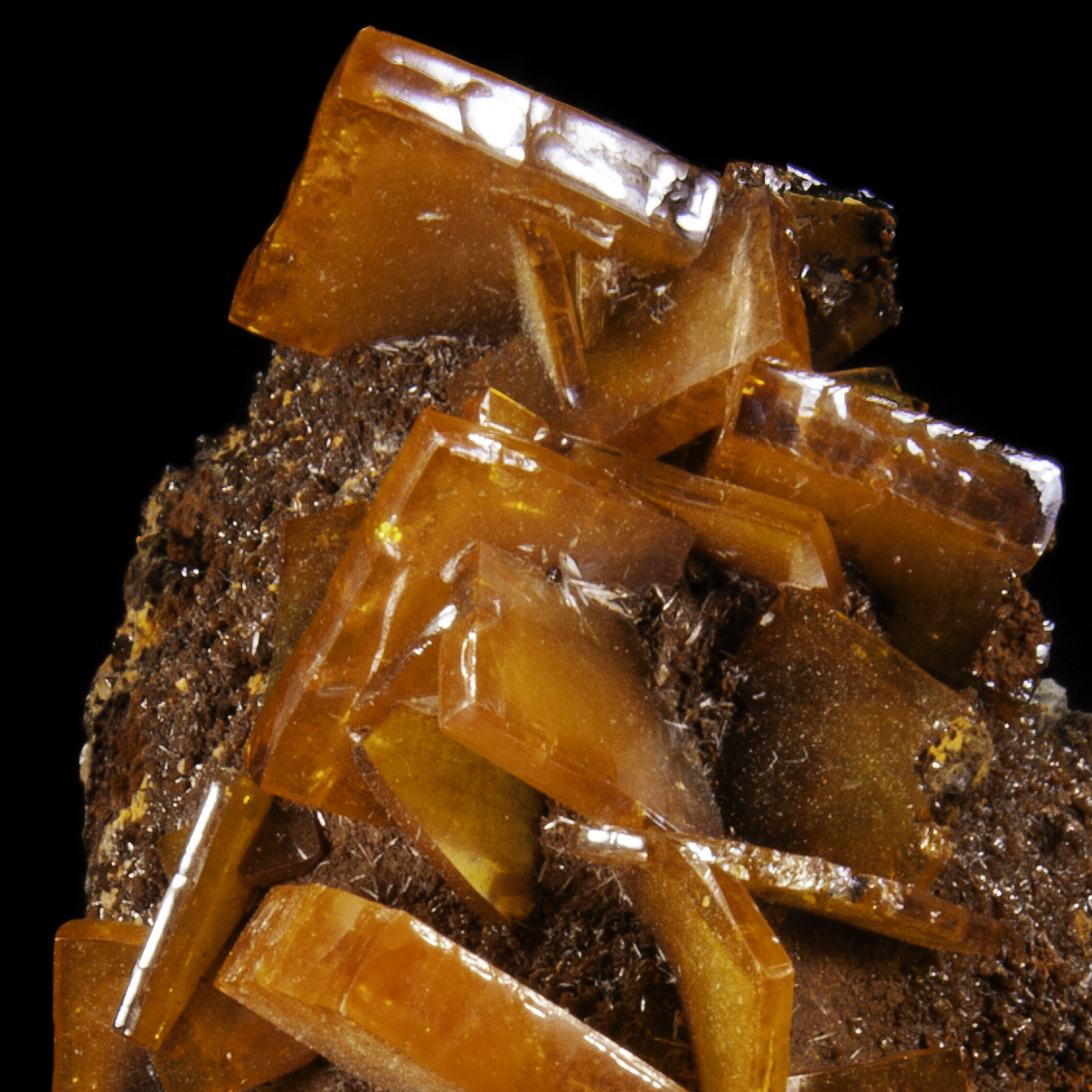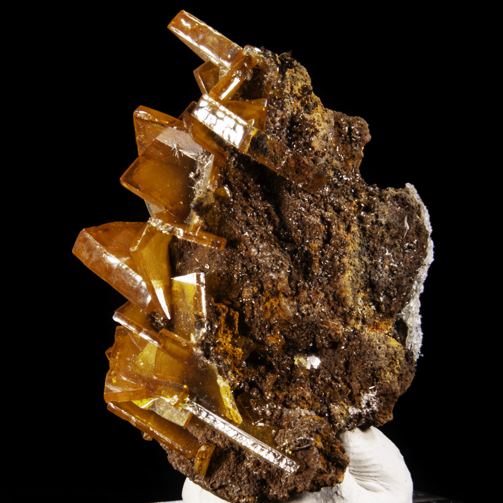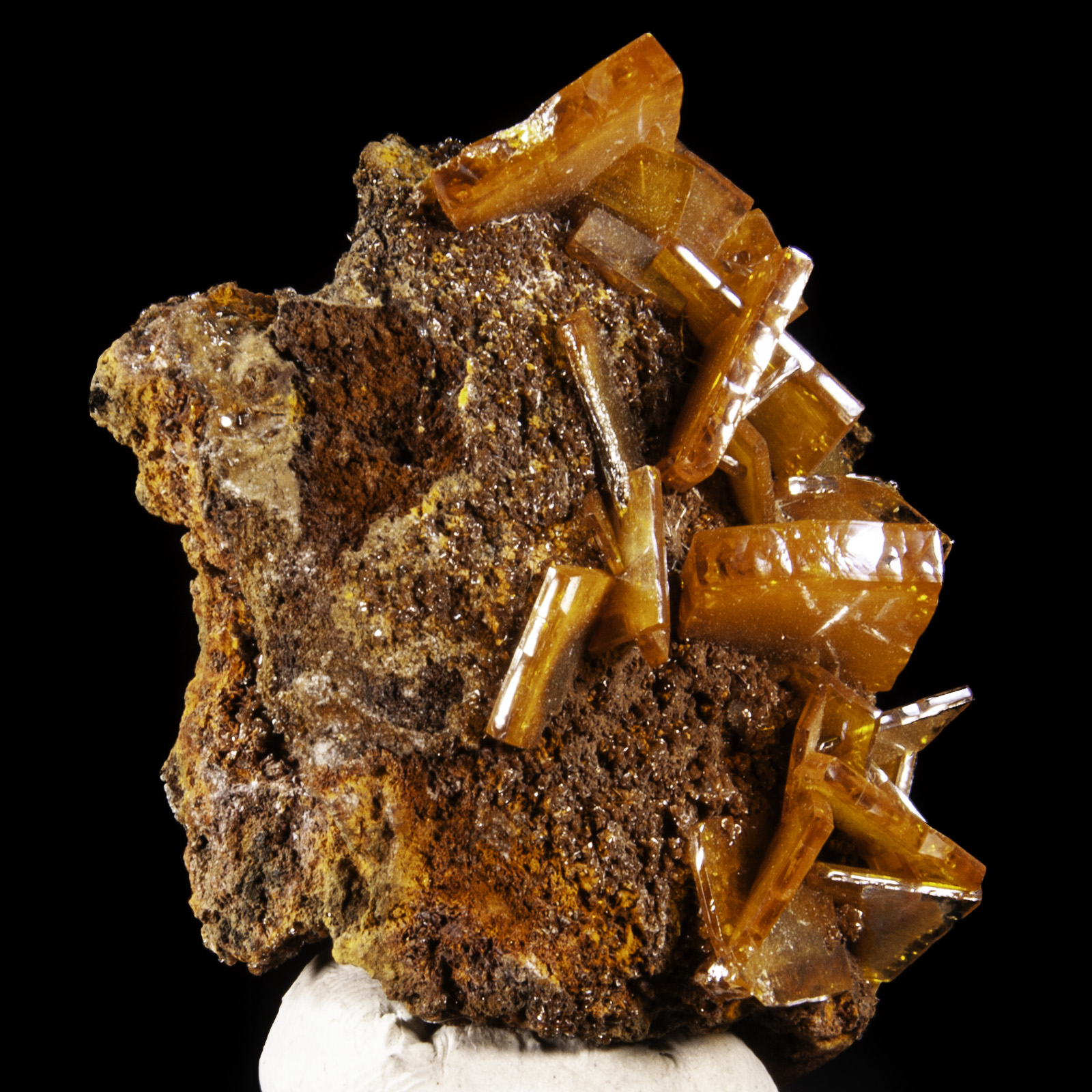 Mineral Description: A superb example of the butterscotch wulfenite crystals that this area is famous for. With crystals to 1.1 cm wide. Excellent condition. Height: 5 Width: 3 Depth: 3 cm