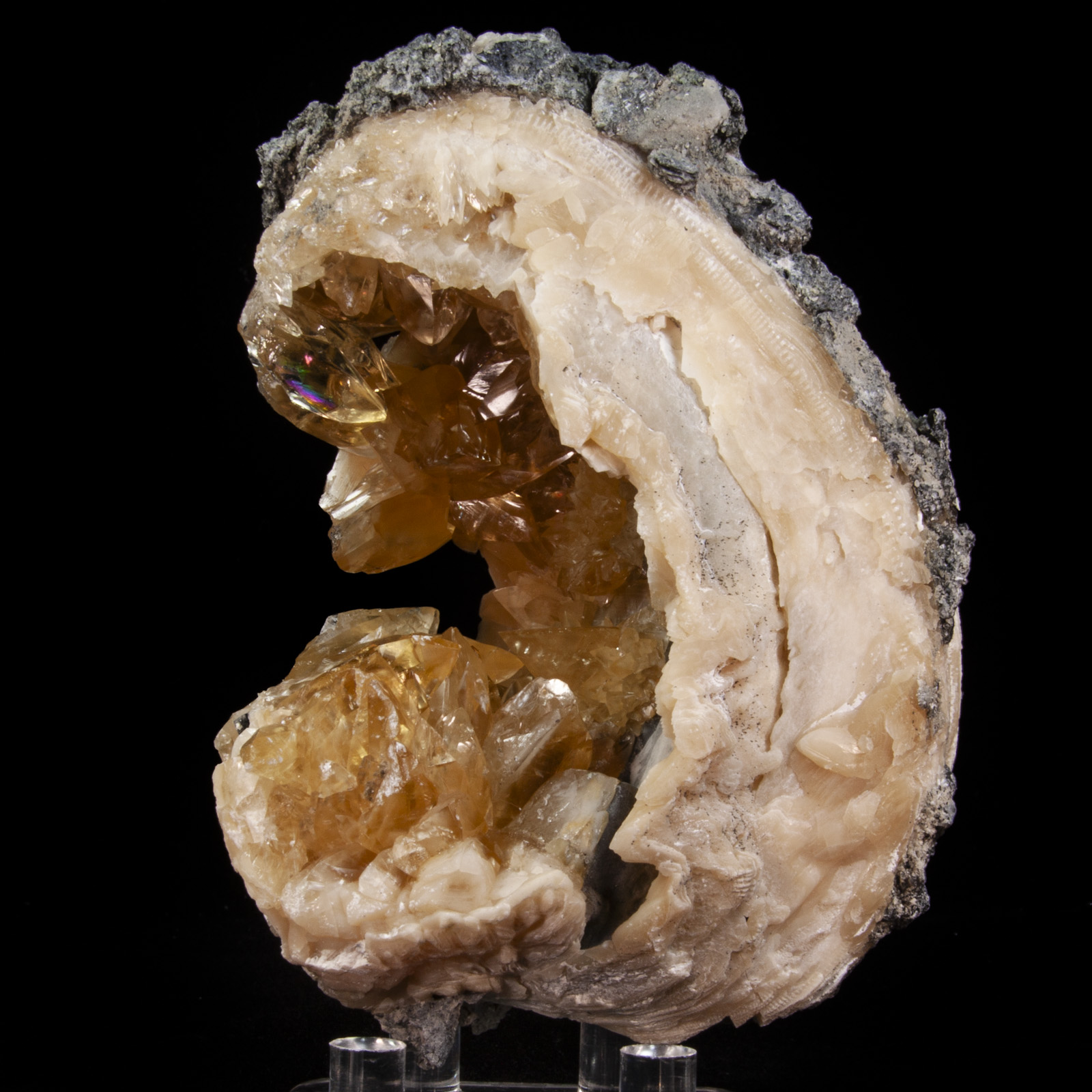 Mineral Description: A specimen of calcite-replaced Mercenaria sp. Clam shell. These are famous worldwide for their unique form and beauty. This specimen fluoresces and phosphoresces nicely. They are formed when groundwater dissolves shell material from a coquina matrix surrounding clams and re-precipitates calcite in the interior (vug) of the shells. Height: 10 Width: 7.2 Depth: 4.5 cm