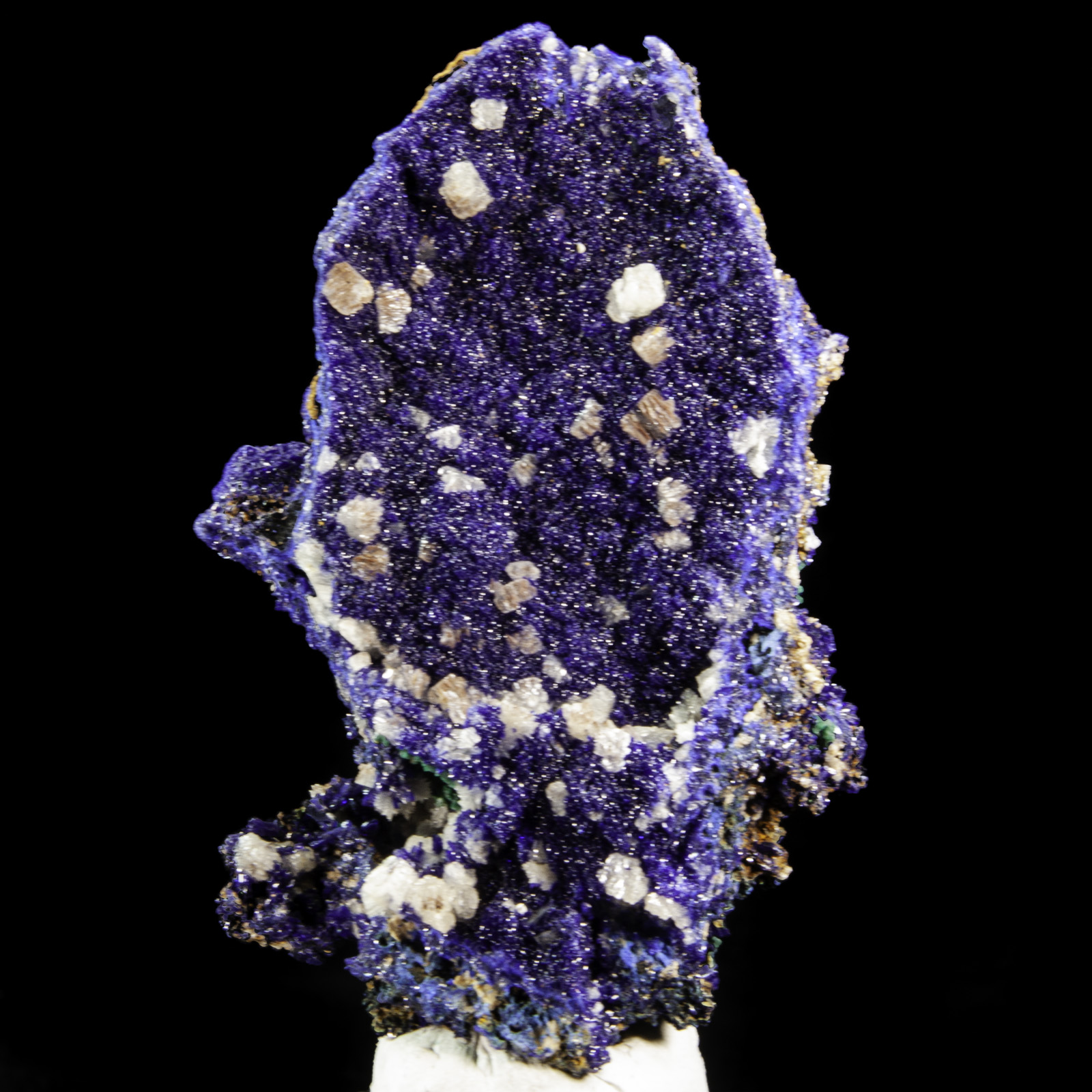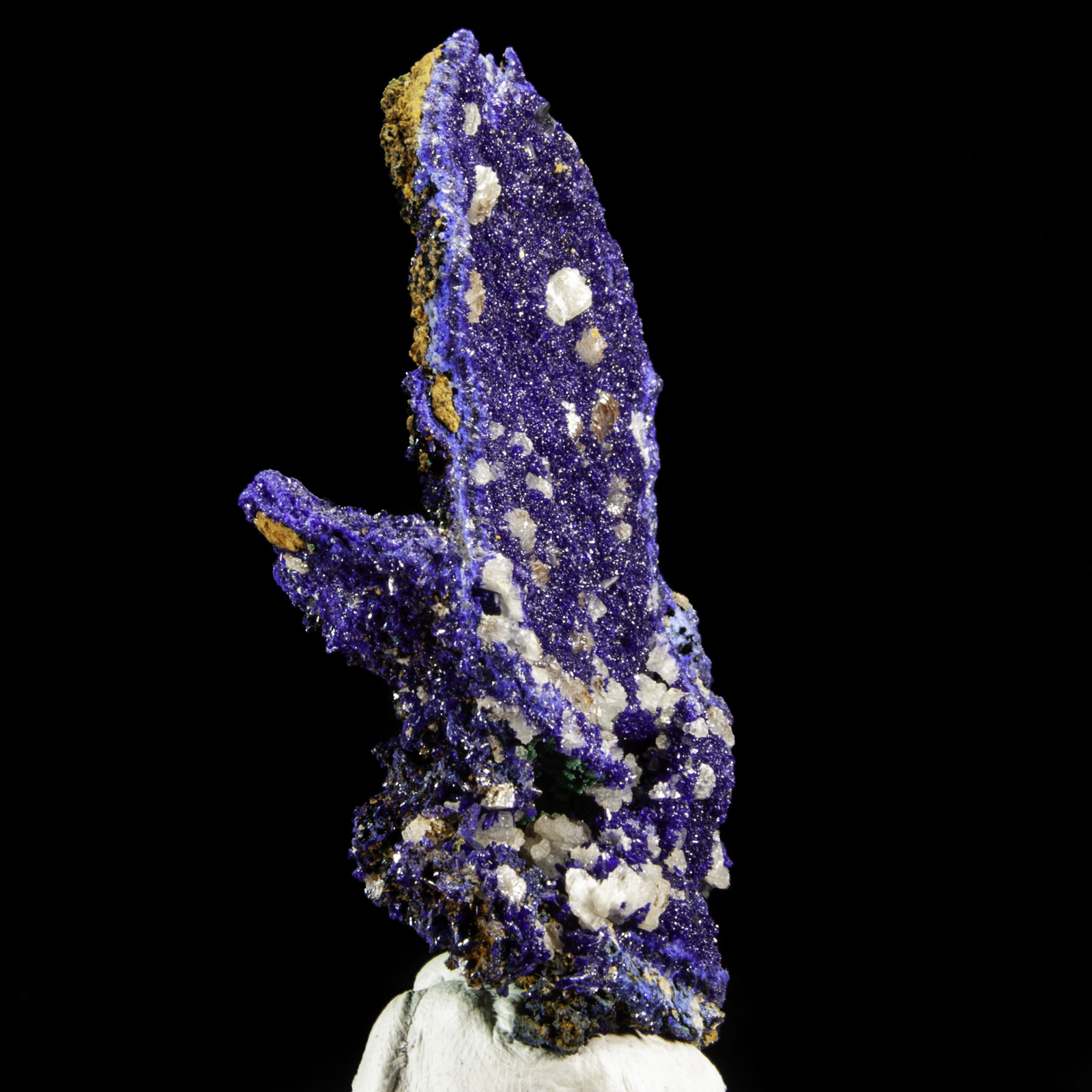 Mineral Description: An elongated plate of deep blue azurite crystals which is dusted with dozens of white cerussite crystals. Minor malachite. Height: 6.4 Width: 3.6 Depth: 2.2 cm