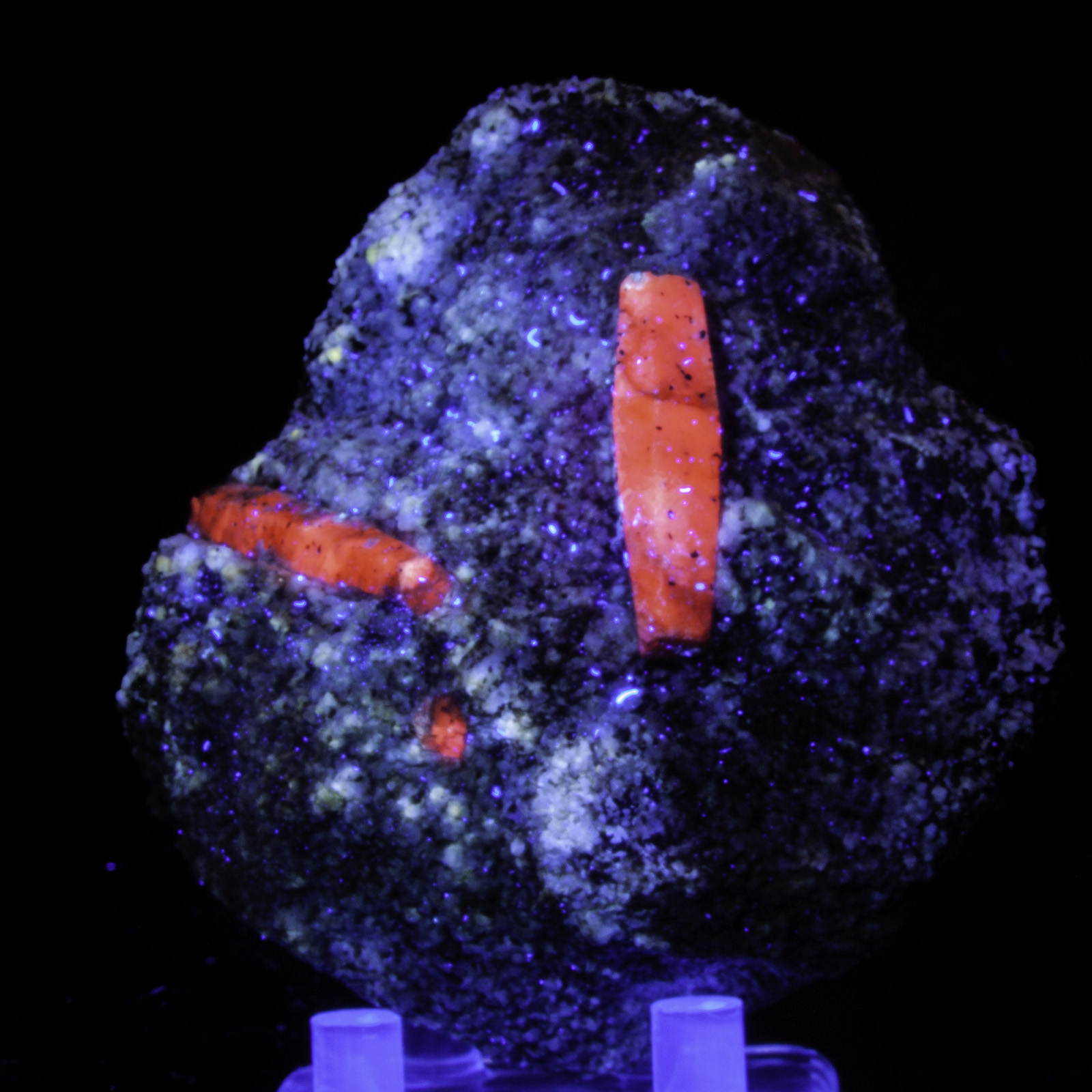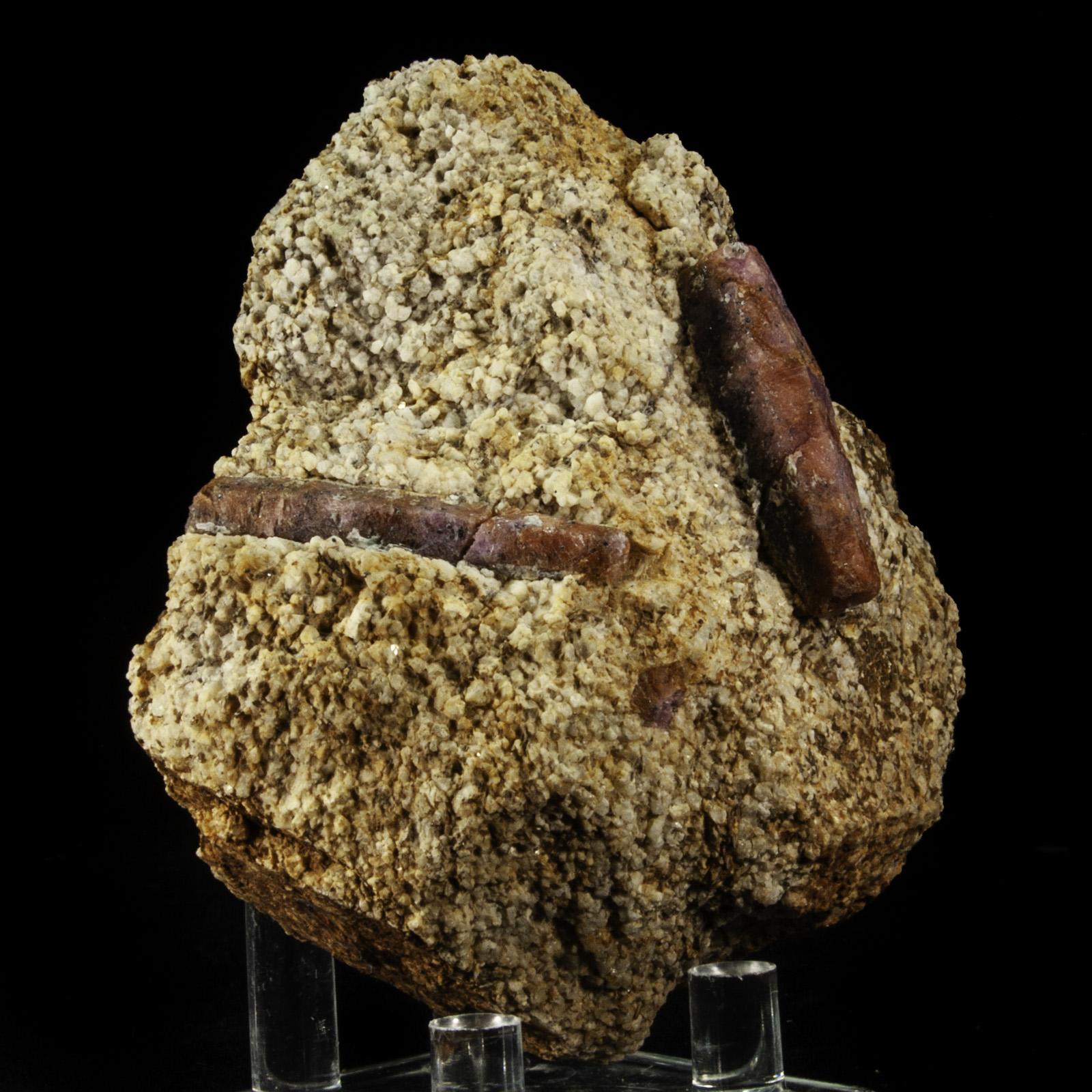 Mineral Description: A pair of terminated red corundum (Ruby) crystals in matrix. The larger ruby is doubly terminated and measures 3 cm in length.The rubies are highly fluorescent. Height: 8.5 Width: 4.5 Depth: 7.5 cm