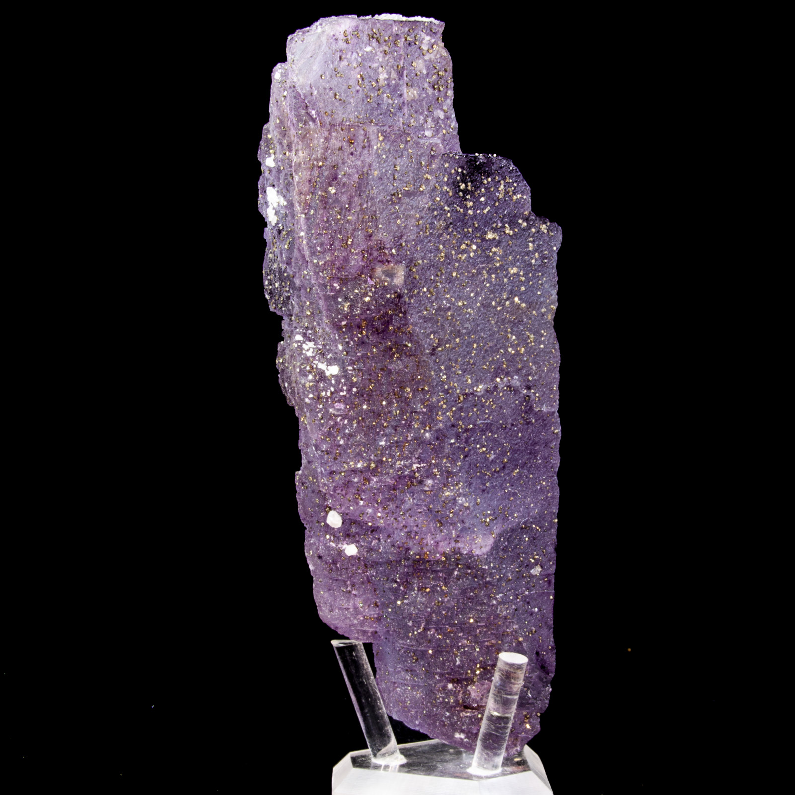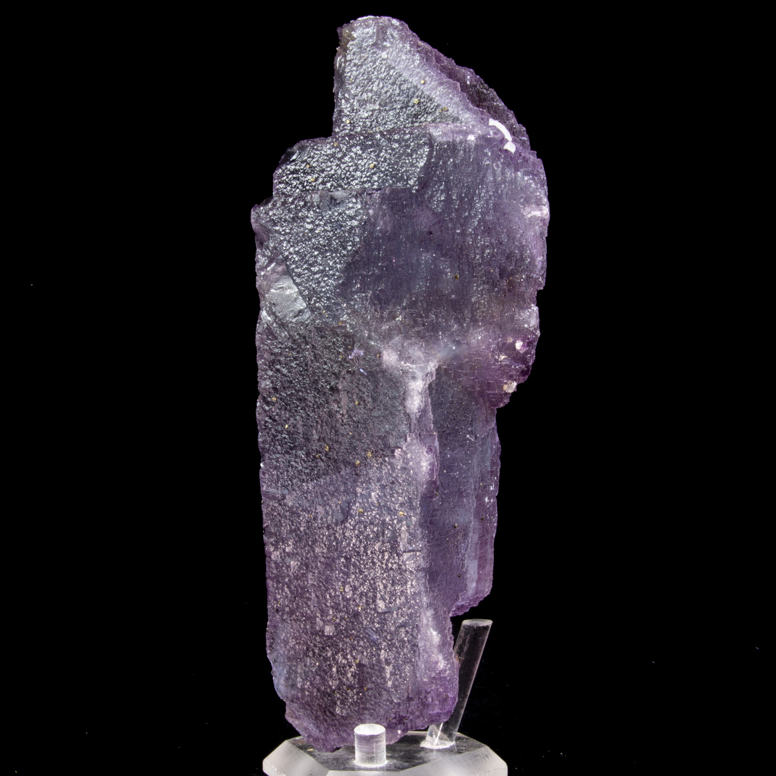 Mineral Description: A floater cluster of translucent purple fluorite cubes (the largest cuge is 9 cm long) with minor calcite and sphalerite. The specimen appears to have been in a brecciated pocket and etched all around. Height: 13 Width: 5.5 Depth: 4.5 cm