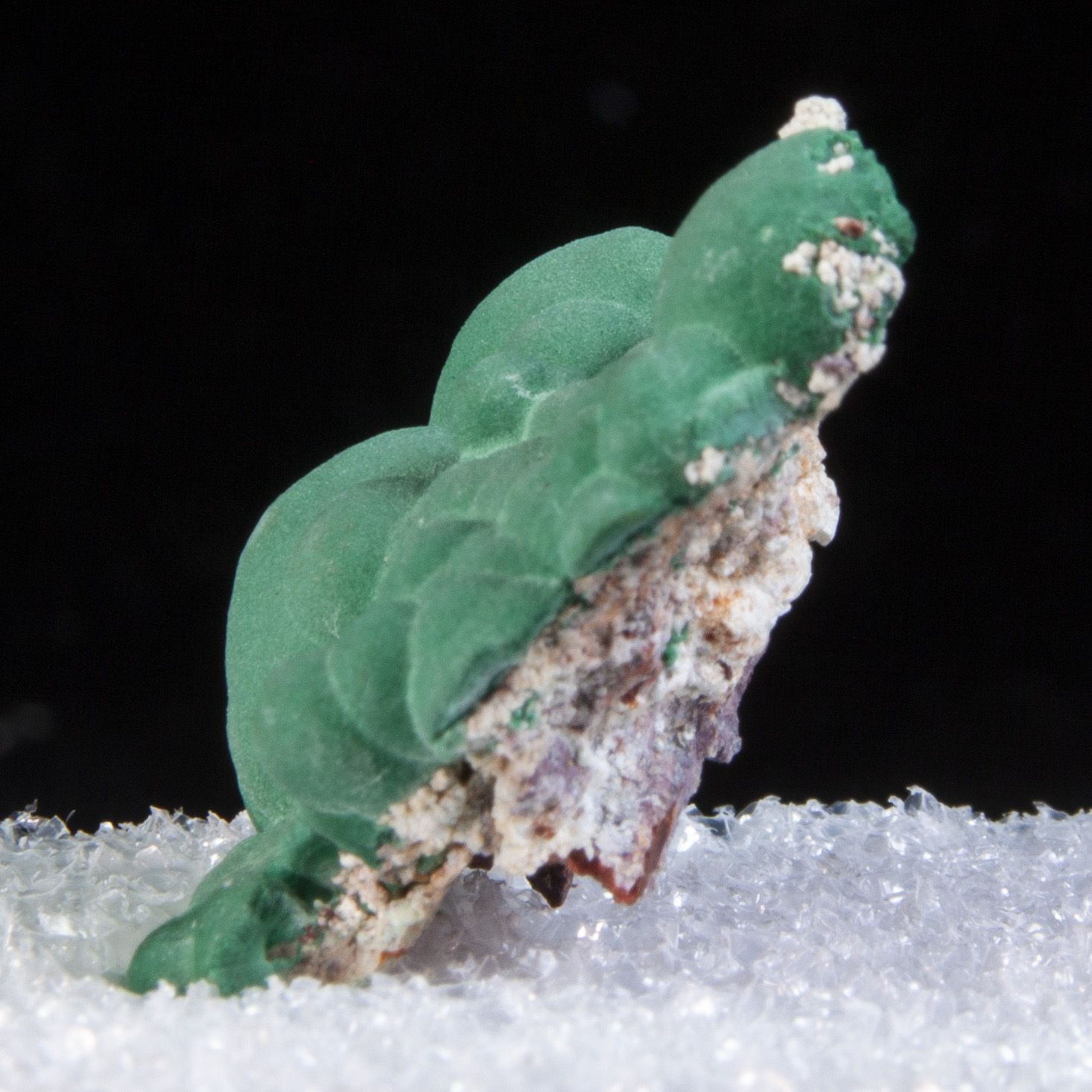 Mineral Description: A bit of matrix coated with a layer of white cerussite and a group of botryoidal green velvety malachite. There is a minor bit of cerussite perched on one edge. Specimen comes in a 2″ perky box. Height: 3.1 Width: 2.5 Depth: 1.2 cm
