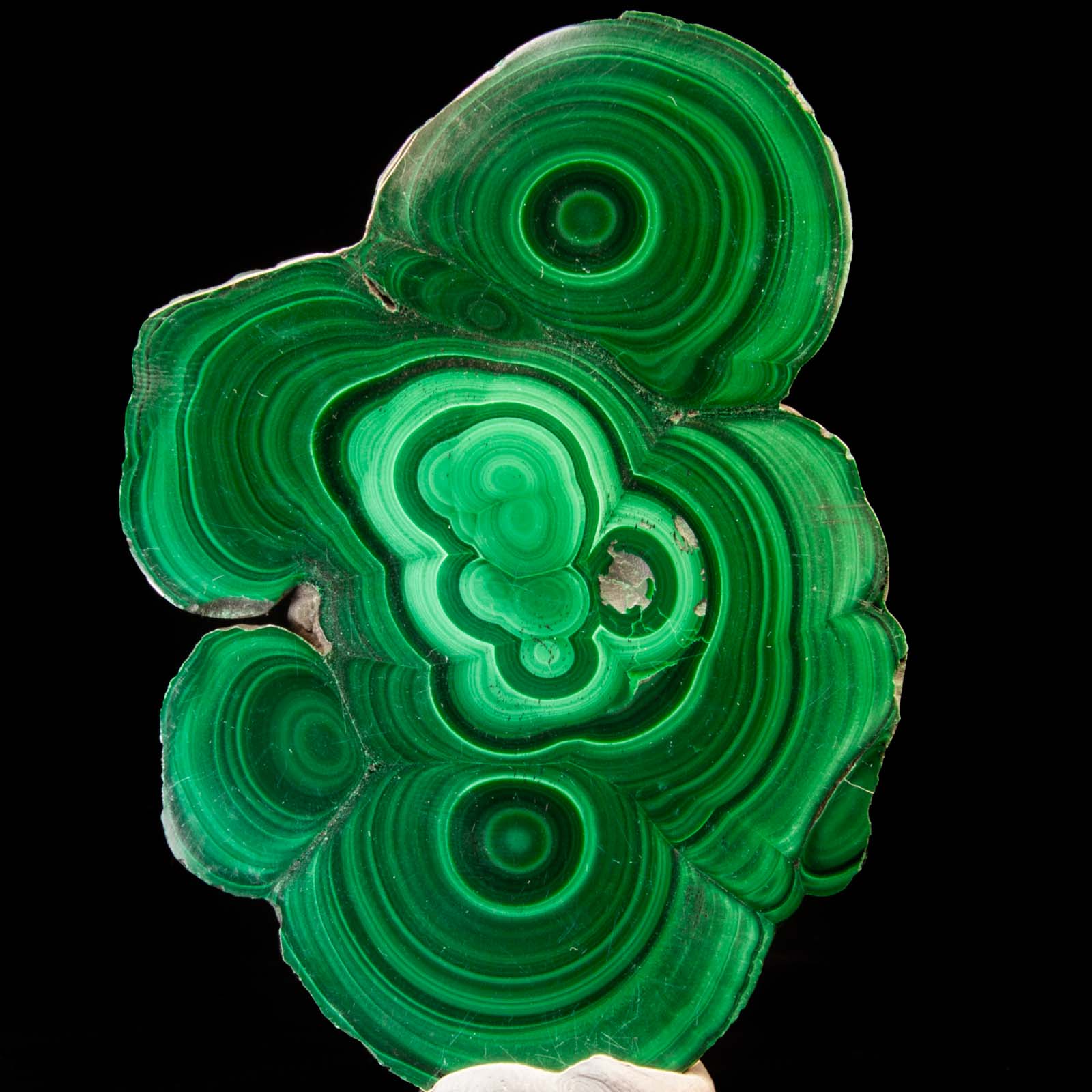 Mineral Description: A nice polished slice through a cauliflower-shaped malachite head. Displays well from either side. Height: 9.7 Width: 6.8 Depth: 0.4 cm