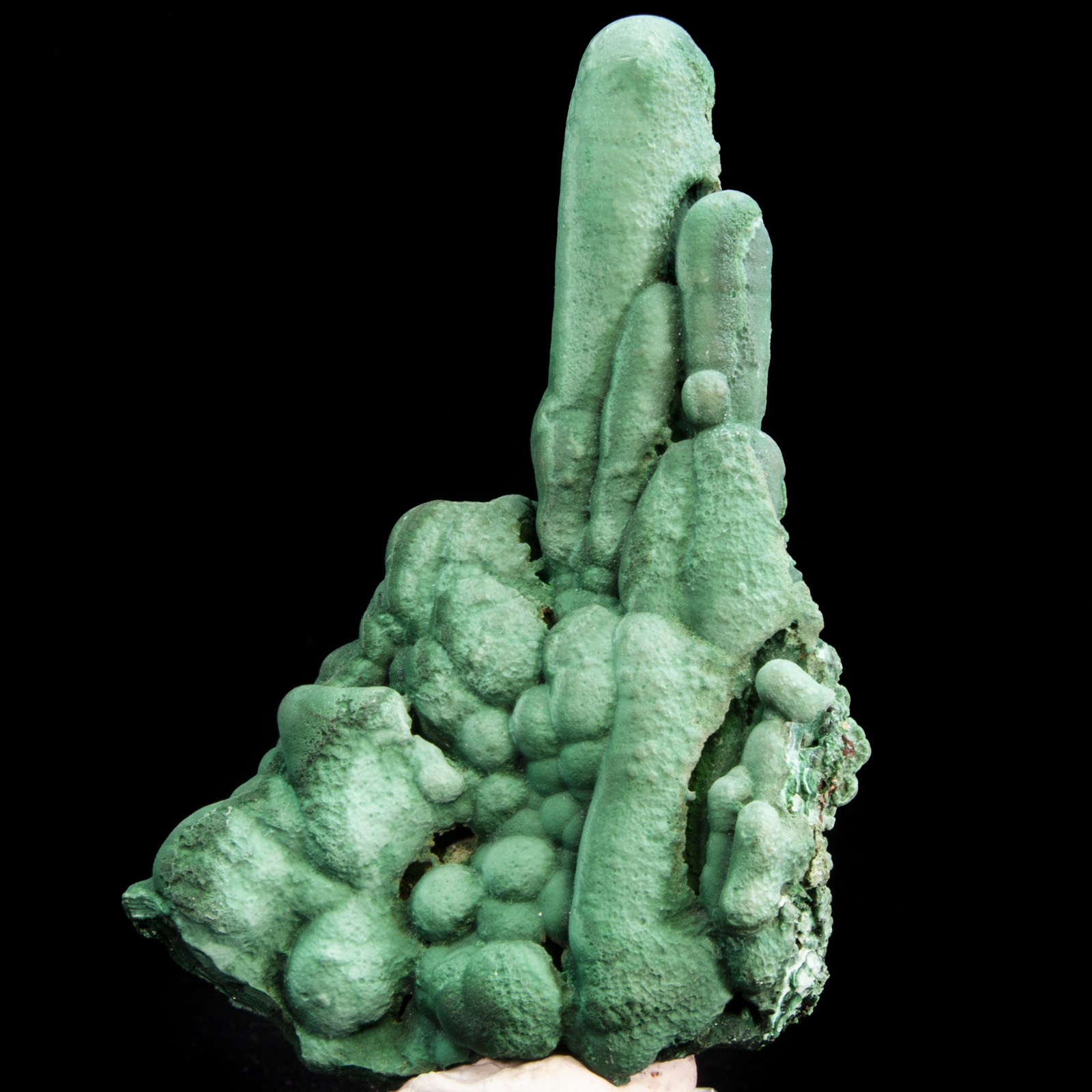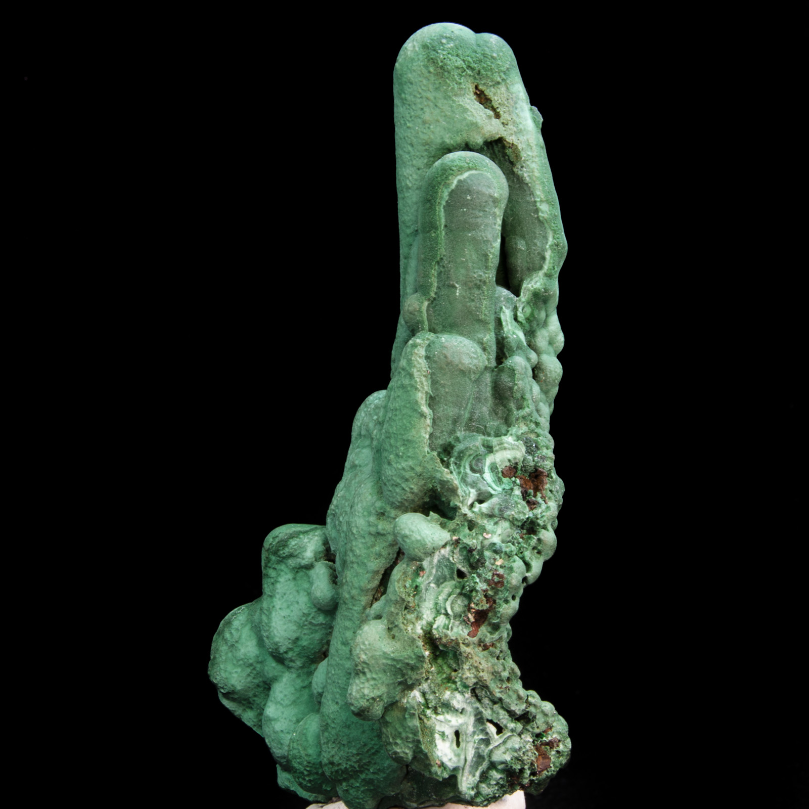 Mineral Description: Superb malachite stalactite group consisting of numerous terminated stalactites rising from a botryoidal malachite base. Excellent condition. Height: 9.5 Width: 6 Depth: 2.5 cm