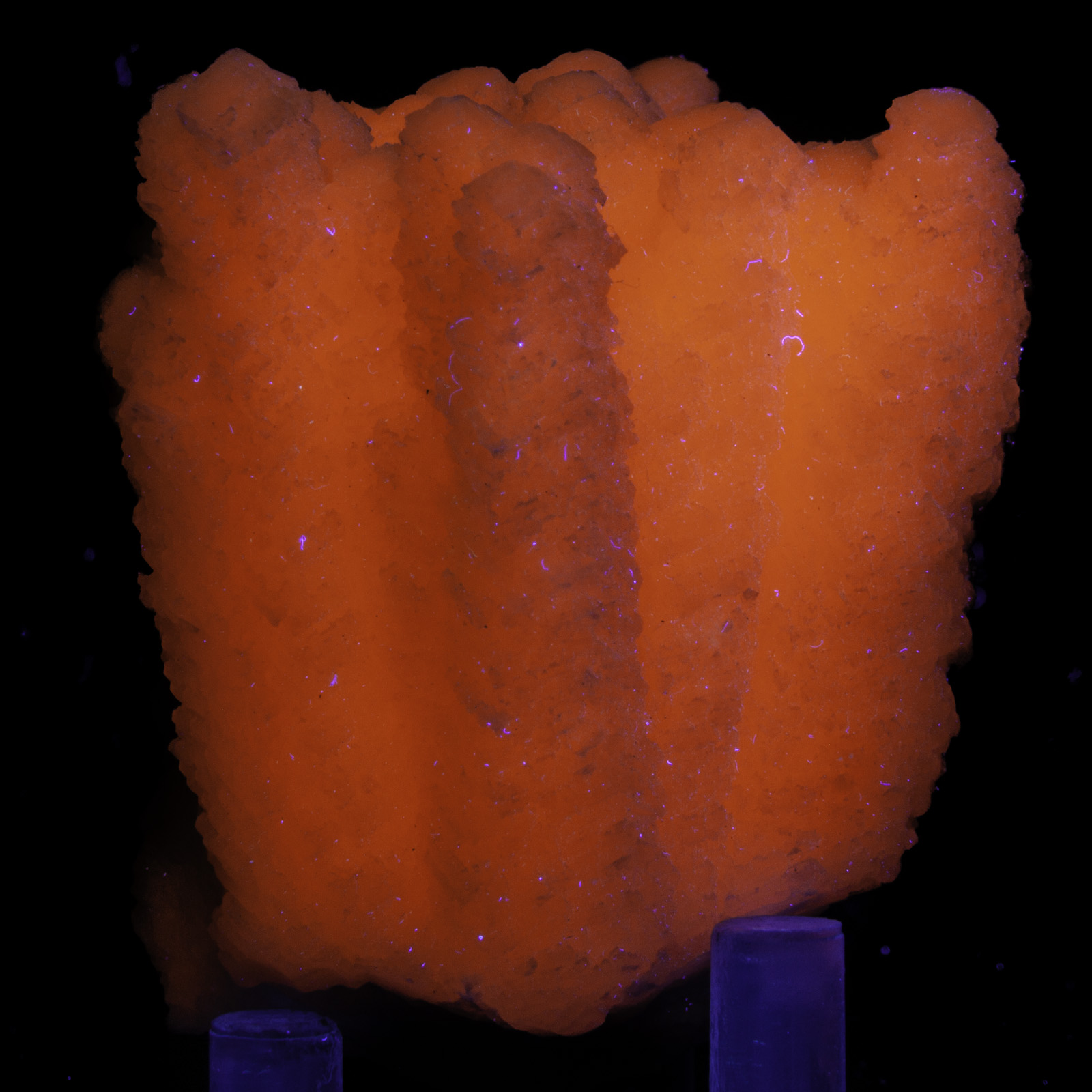 Mineral Description: A highly fluorescent (hot pink) manganocalcite cluster consisting of terminated stacked columns of light pink manganocalcite crystals overgrowing another mineral (appears to be calcite). Exccellent condition. Height: 6.5 Width: 5 Depth: 4.8 cm