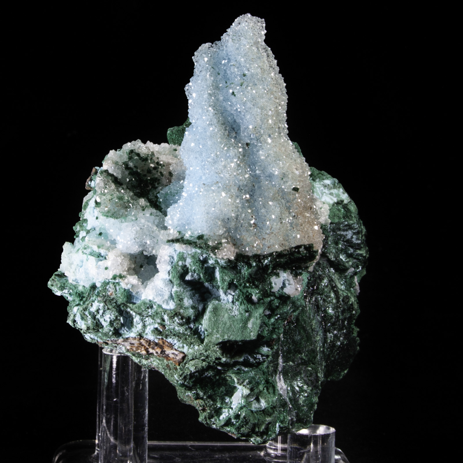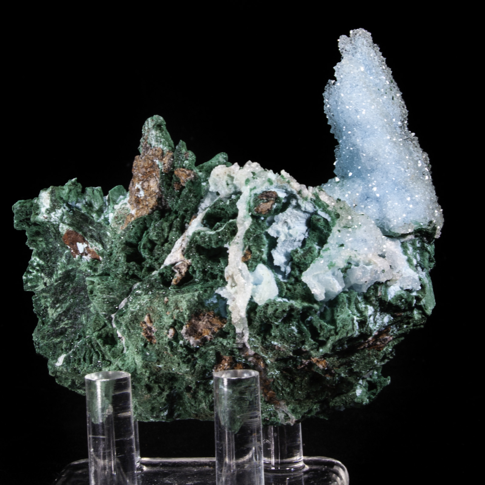 Mineral Description: A malachite matrix which is partially coated with chrysocolla. There is a nice terminated chrysocolla stalactite ps malachite that is coated with drusy quartz. Excellent condition. Height: 7.5 Width: 6 Depth: 4 cm