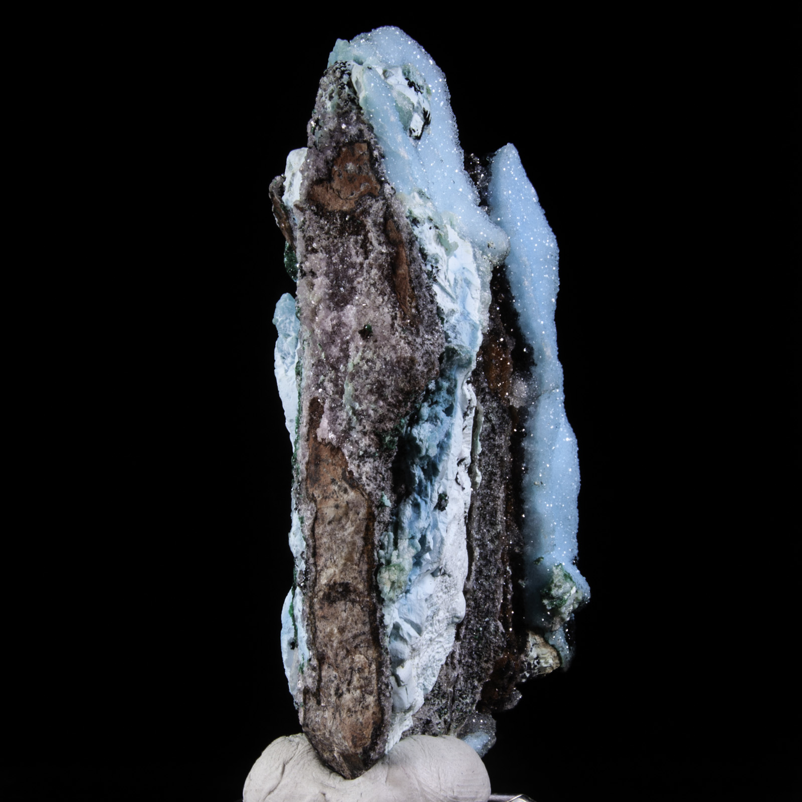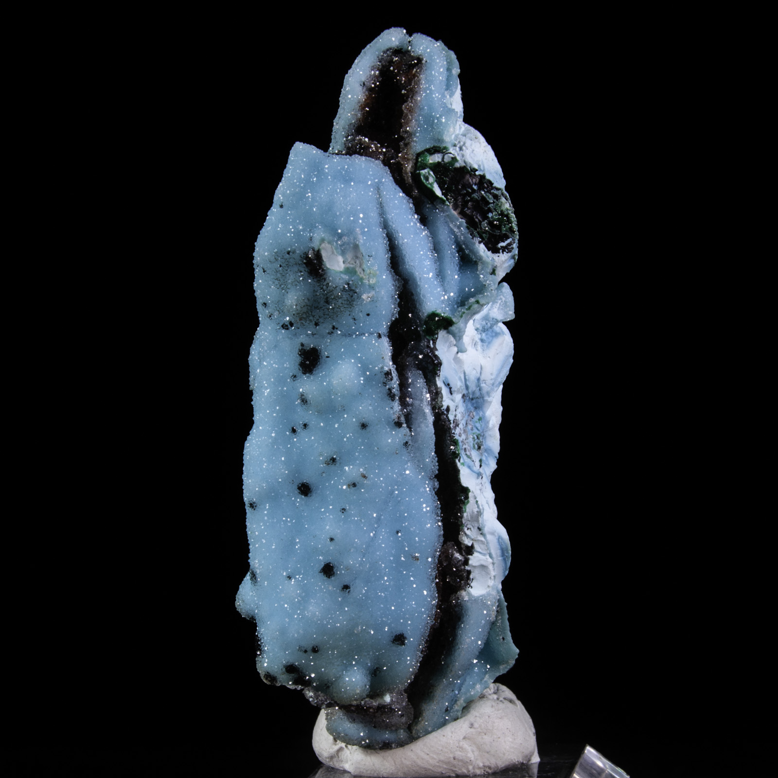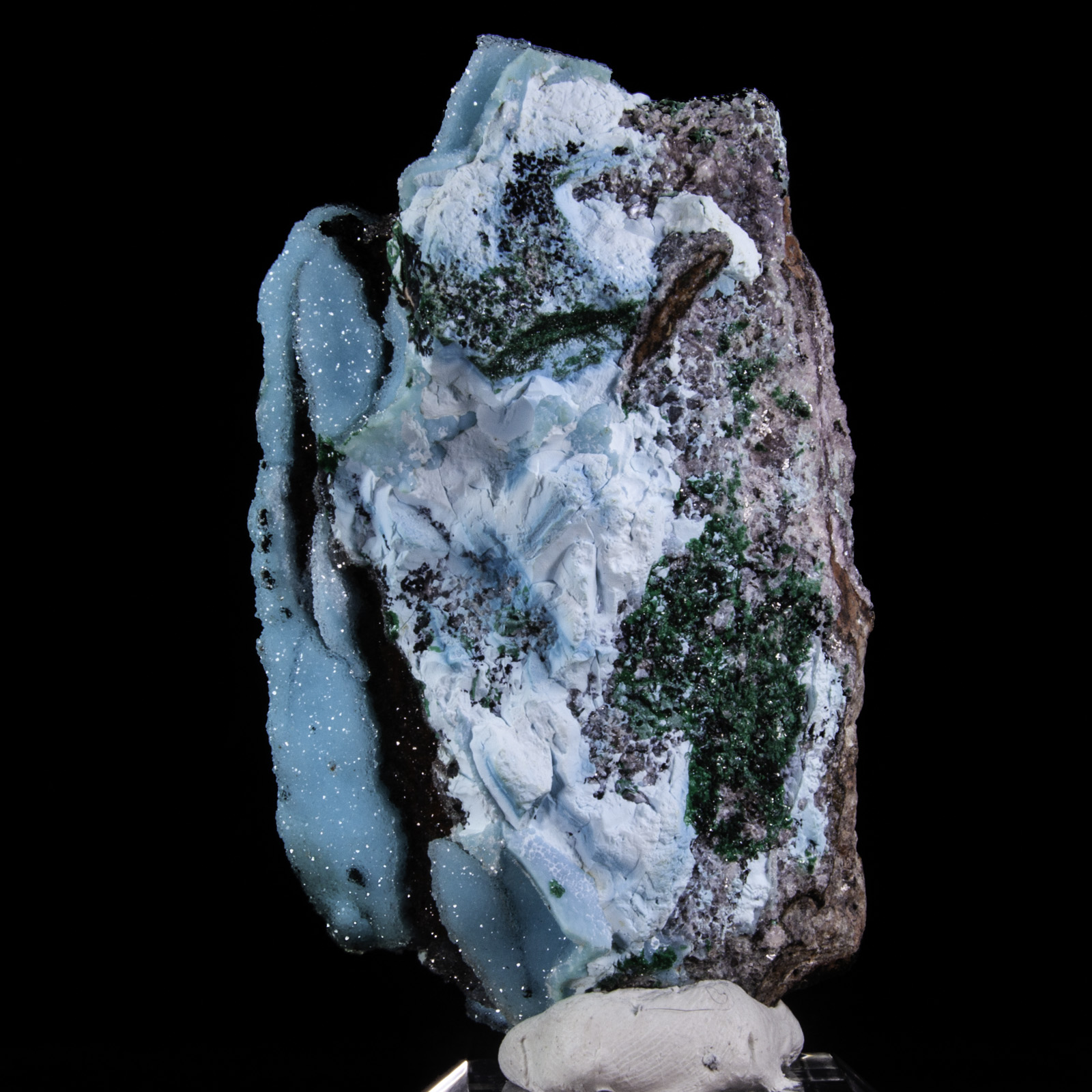 Mineral Description: A bit of brecciated matrix coated with baby blue chrysocolla and minor malachite. The chrysocolla is coated with drusy quartz. Height: 8 Width: 5 Depth: 2.8 cm