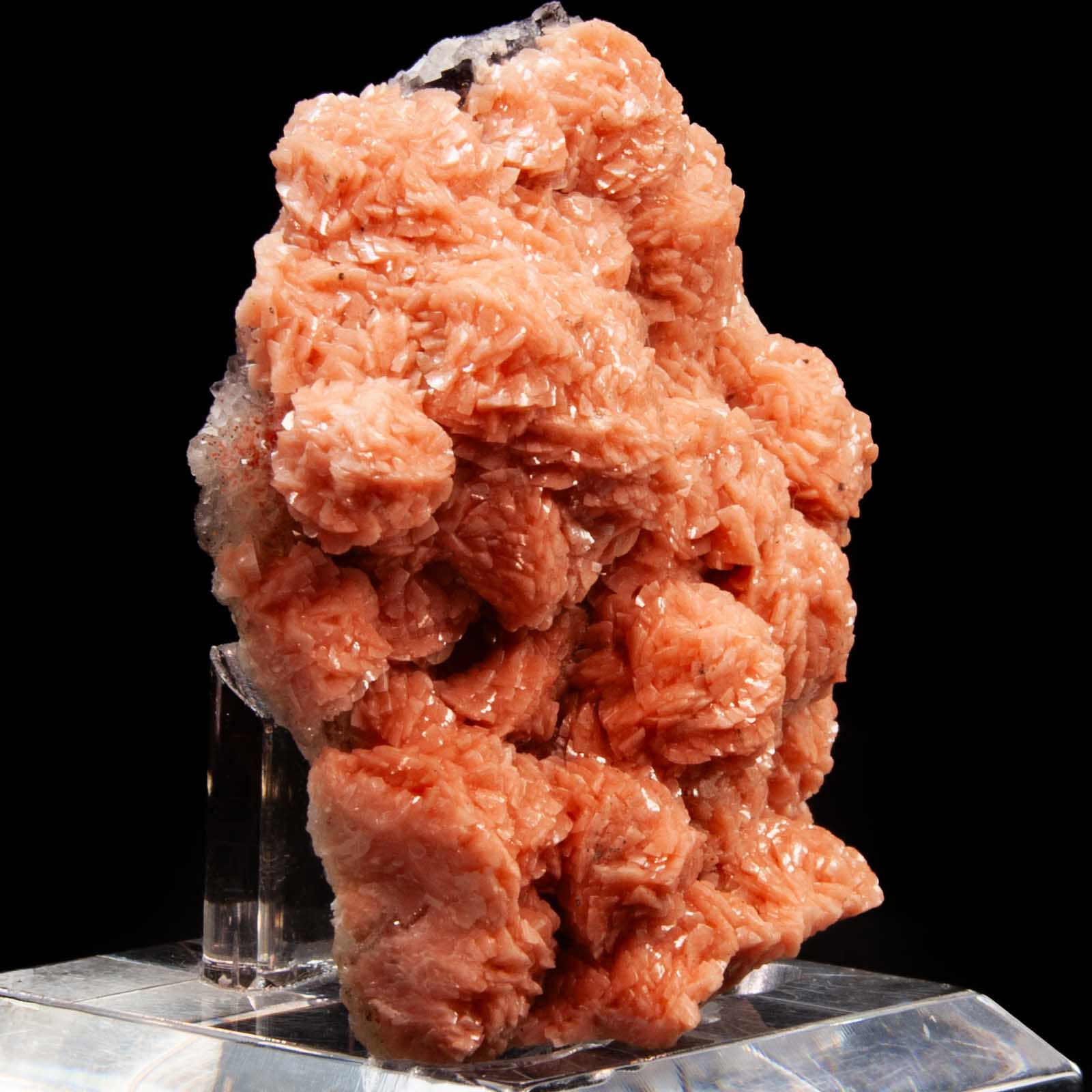 Mineral Description: From the collection of Ray Denicourt, this is a very nice cluster of pink rhodochrosite crystals. The specimen comes with a custom plexiglass base. Height: 5.5 Width: 5 Depth: 1.5 cm