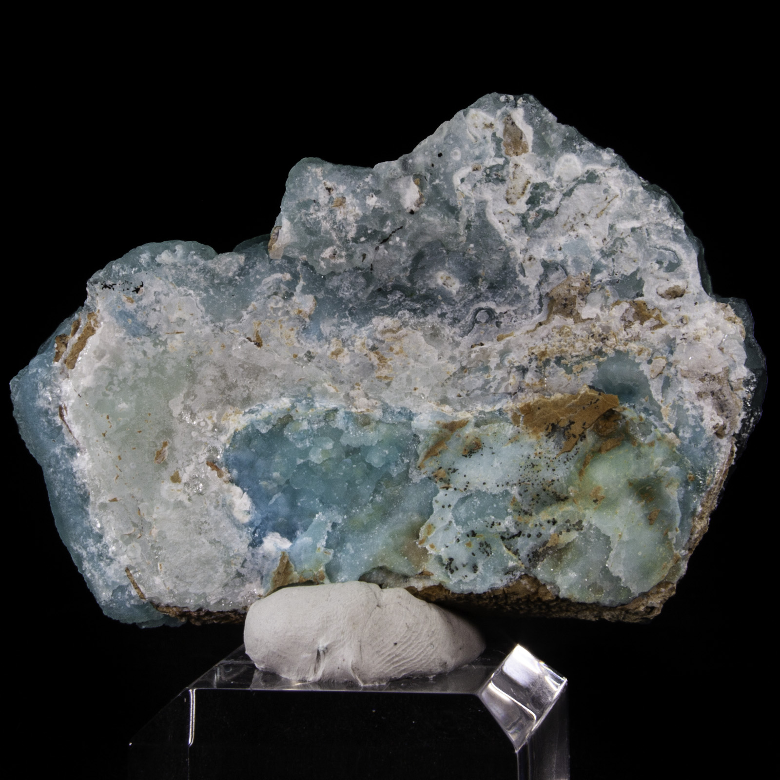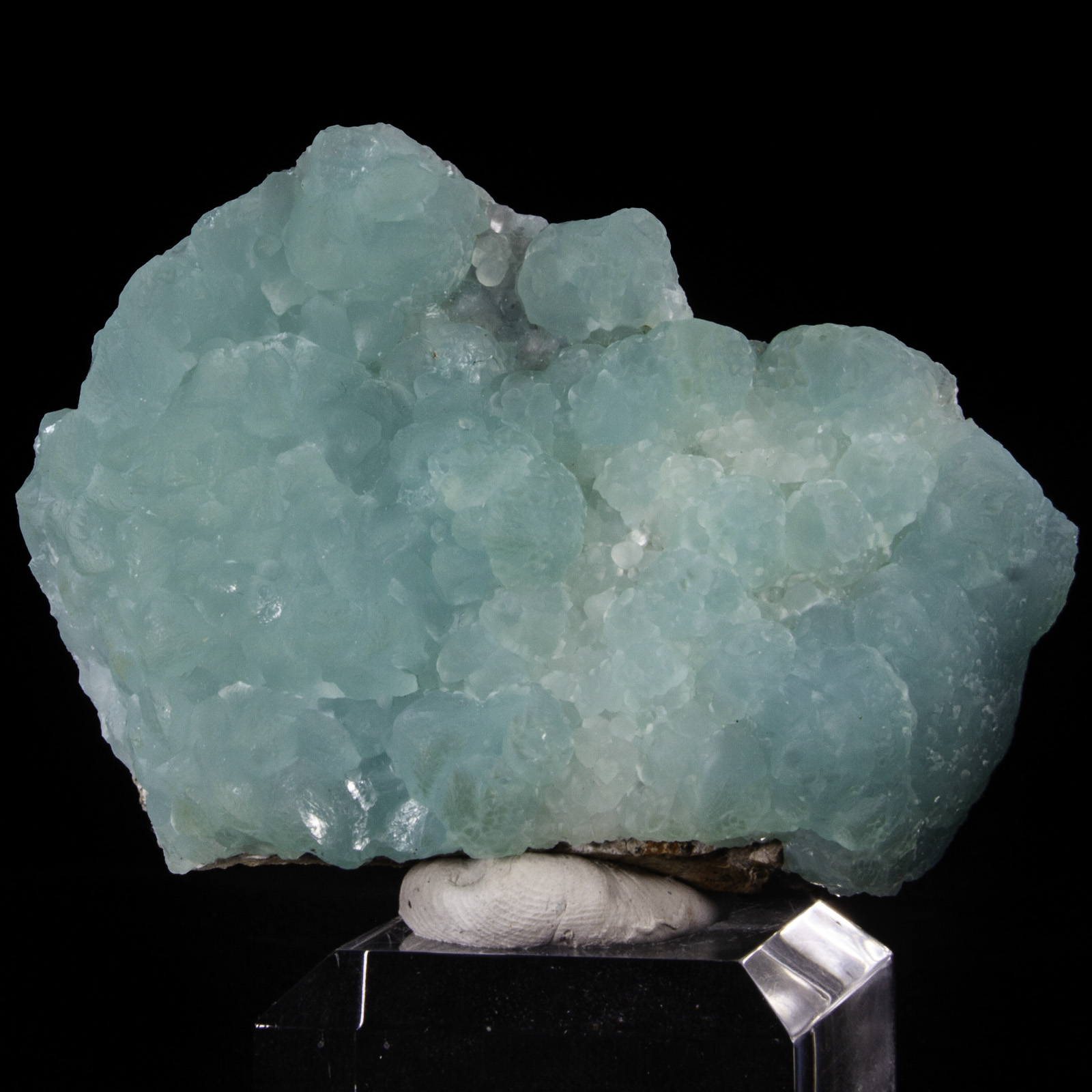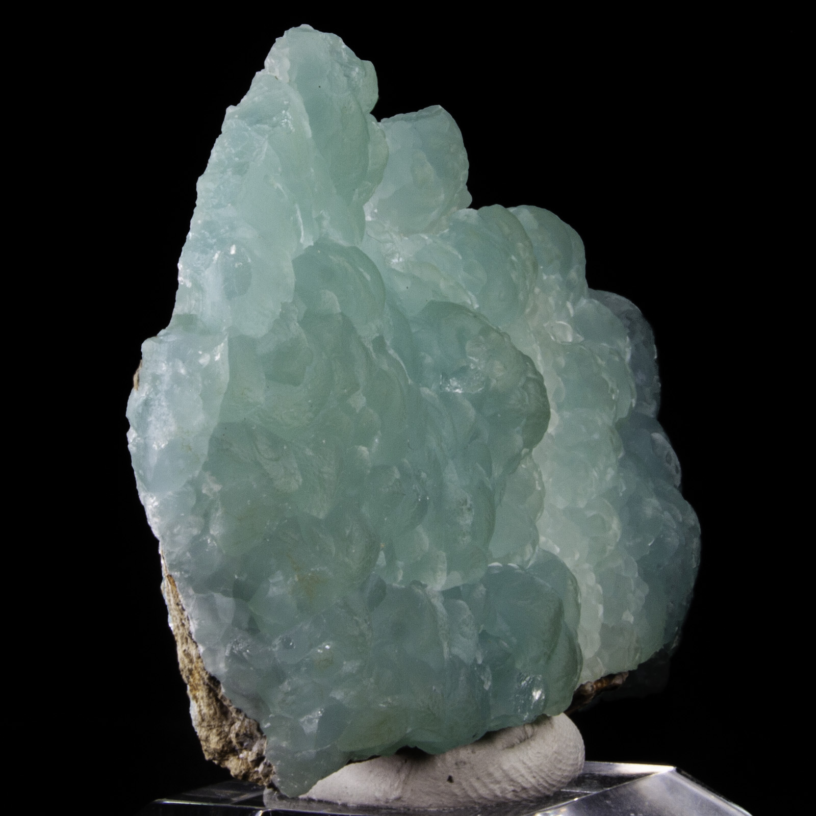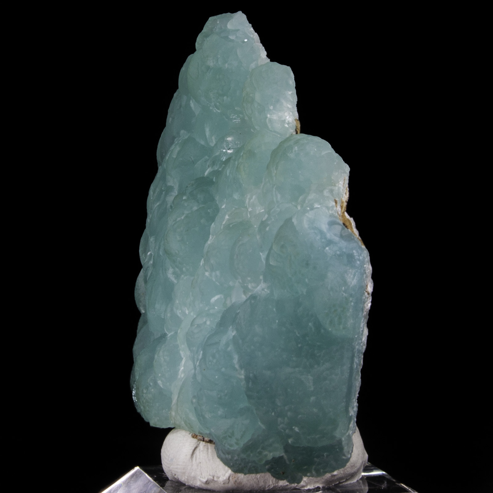 Mineral Description: A crust of botryoidal translucent blue-green smithsonite on matrix. Excellent condition. Height: 8 Width: 5.5 Depth: 2 cm