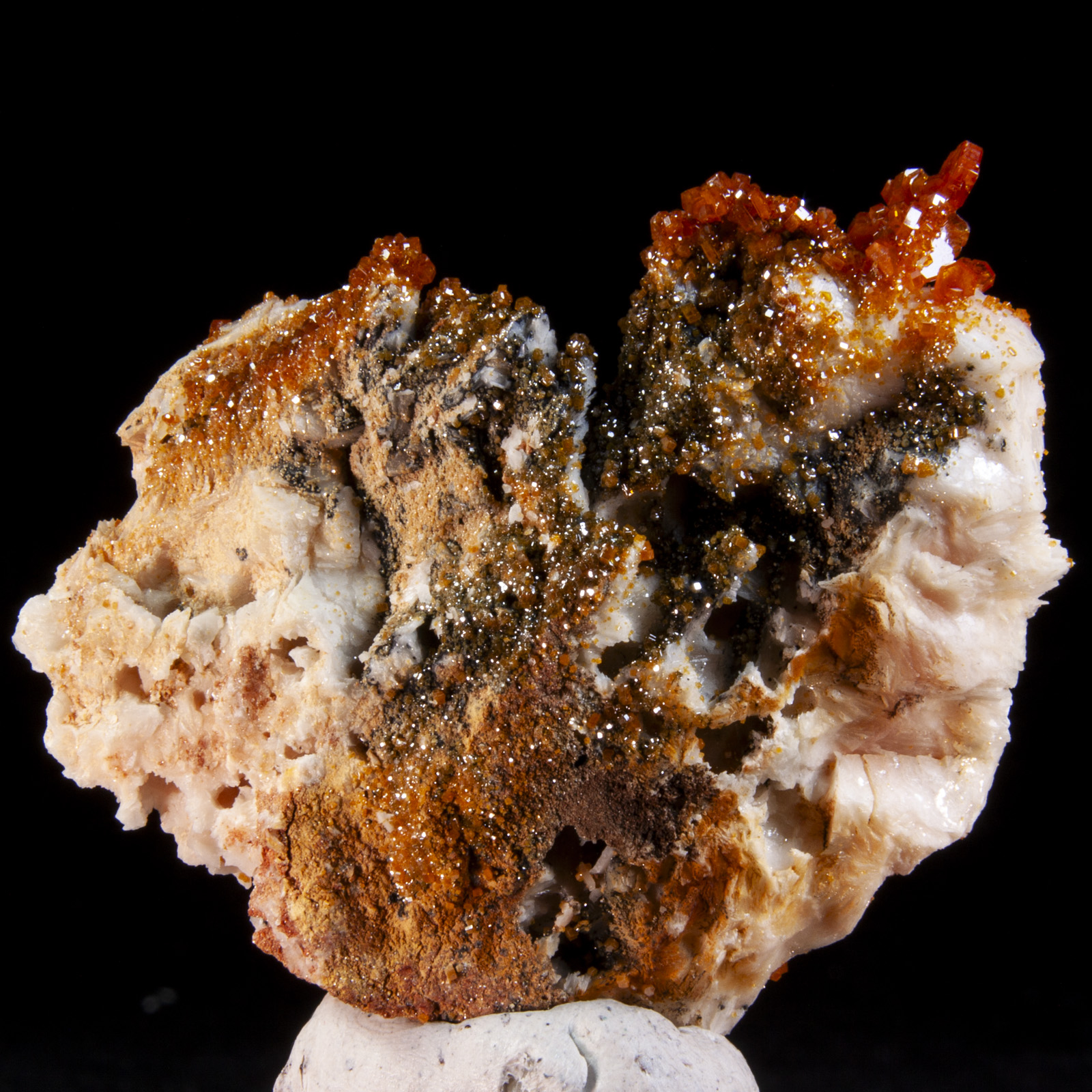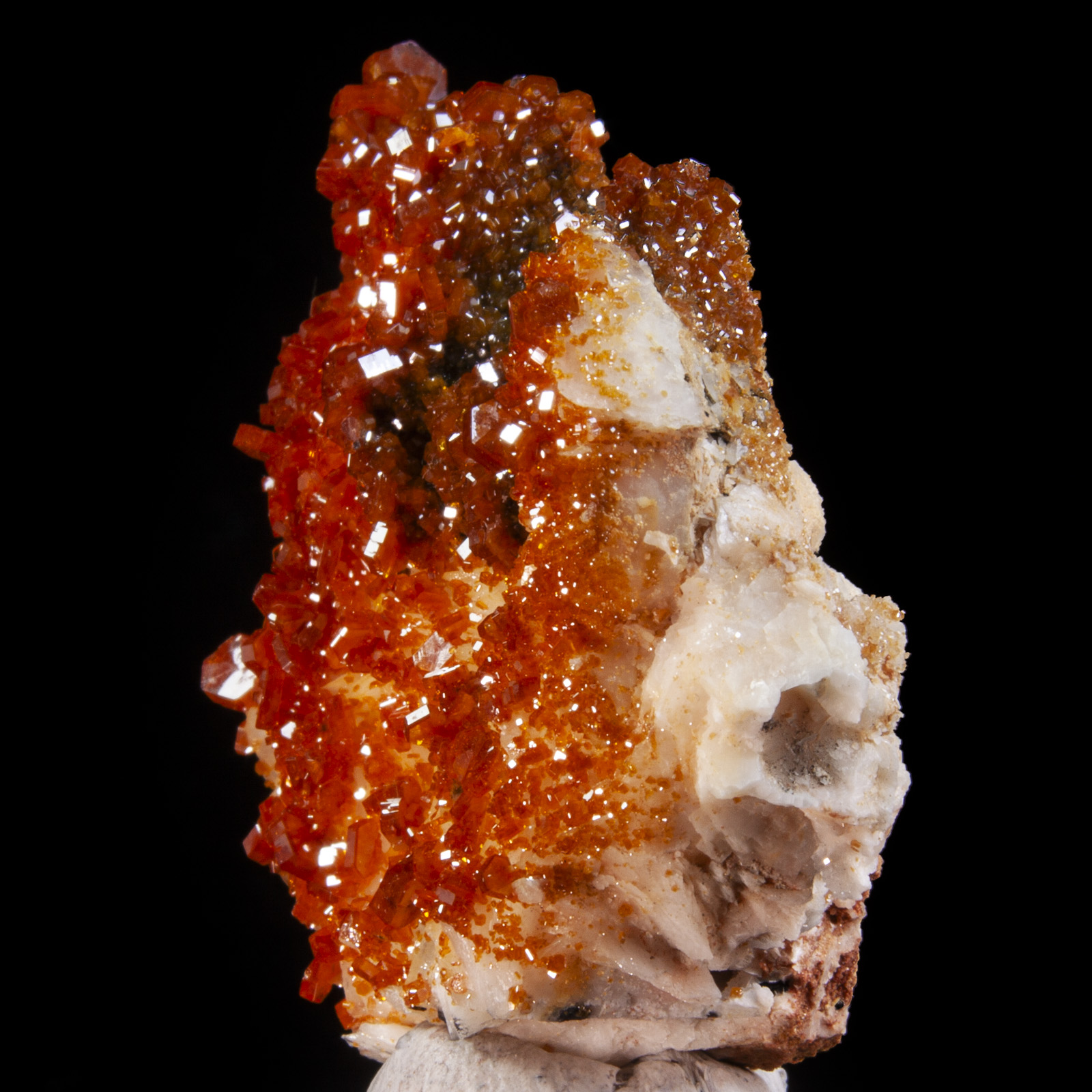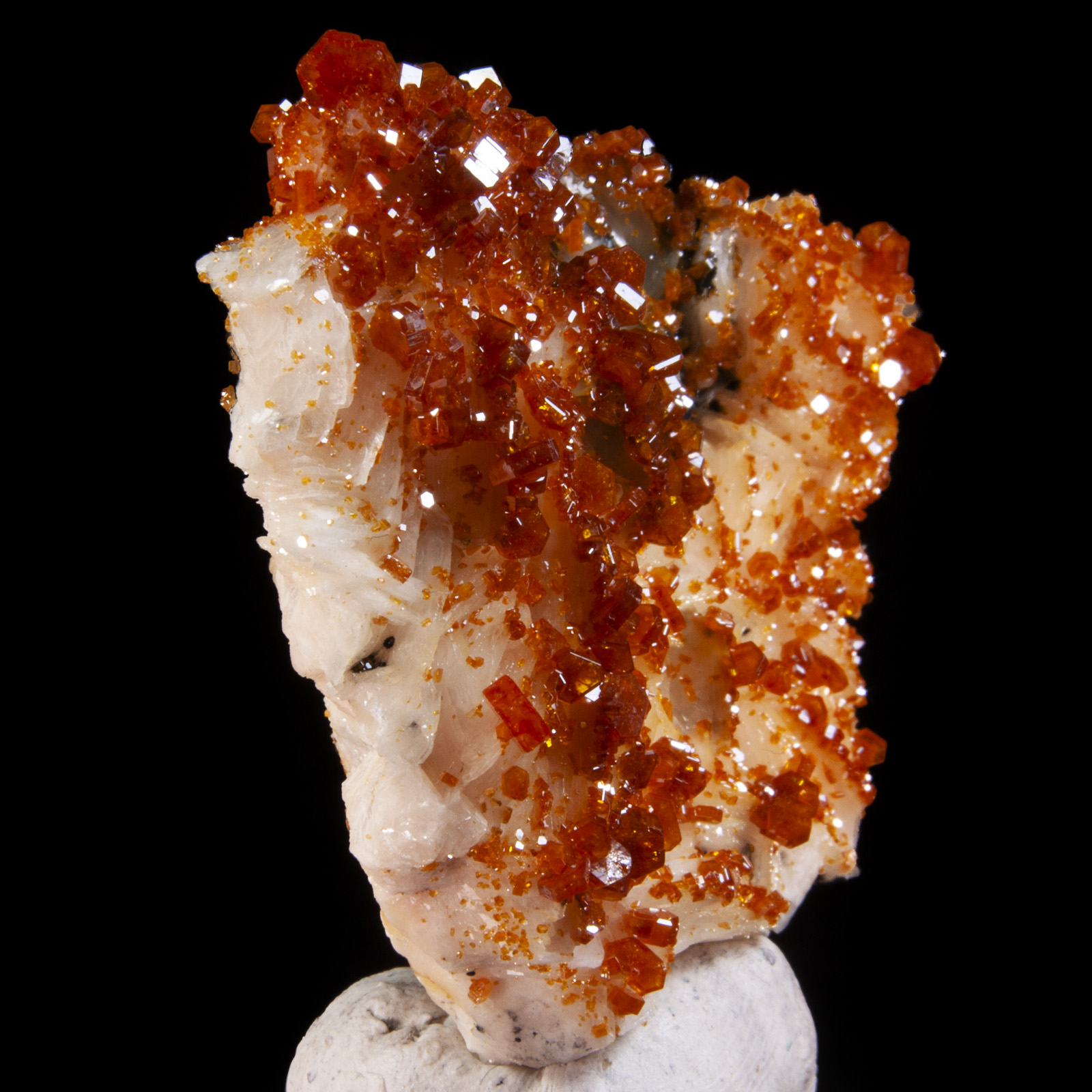 Mineral Description: A matrix of white baryte hosts hundreds of bright red, highly lustrous vanadinite crystals. Height: 6 Width: 4.5 Depth: 1.8 cm